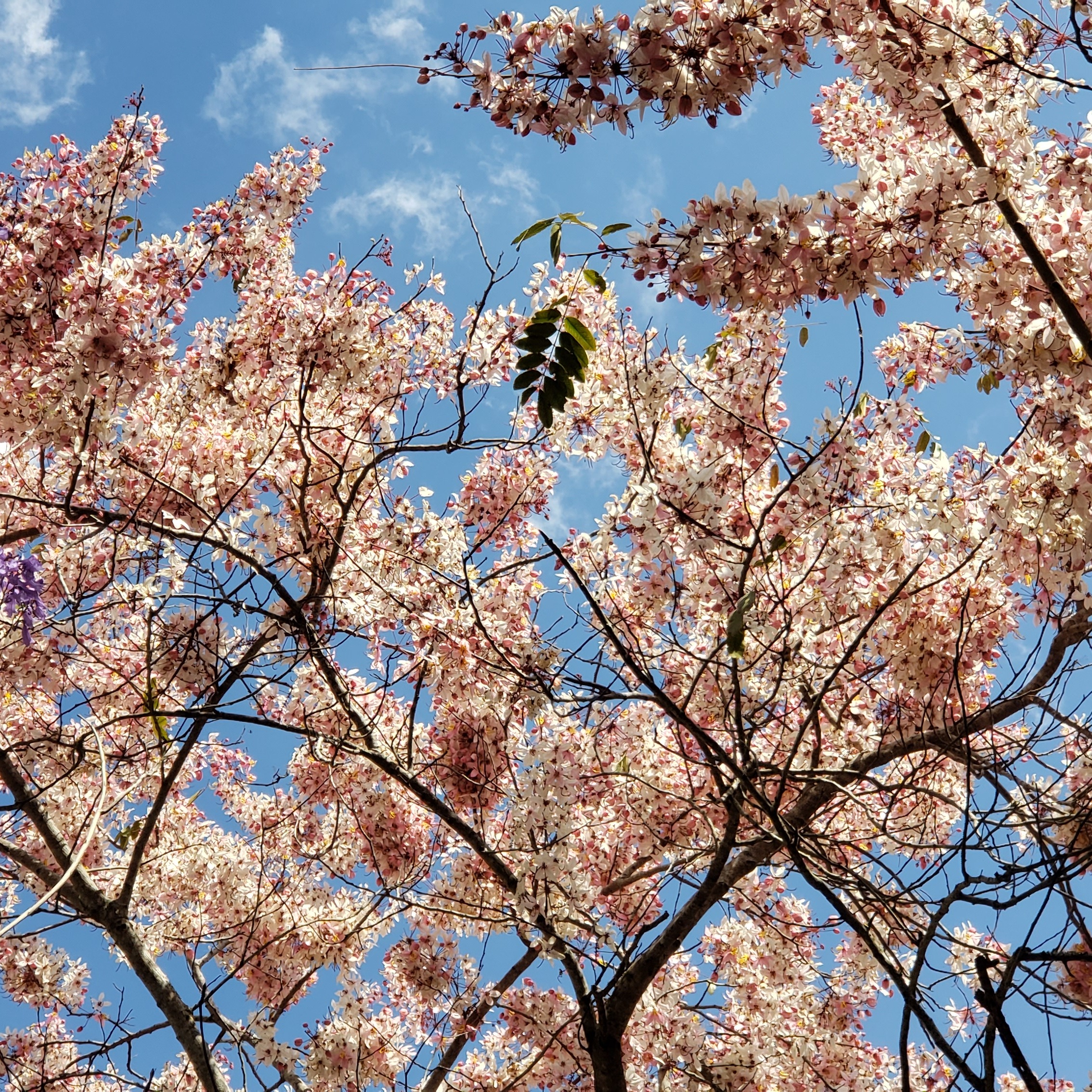 Large very showy flowering tree to 100′. Foliage pinnate, silky when young. Flowers very showy, pink, flowering season summer. Fruit a 1′ long brown pod with many seeds covered in sticky pulp.
