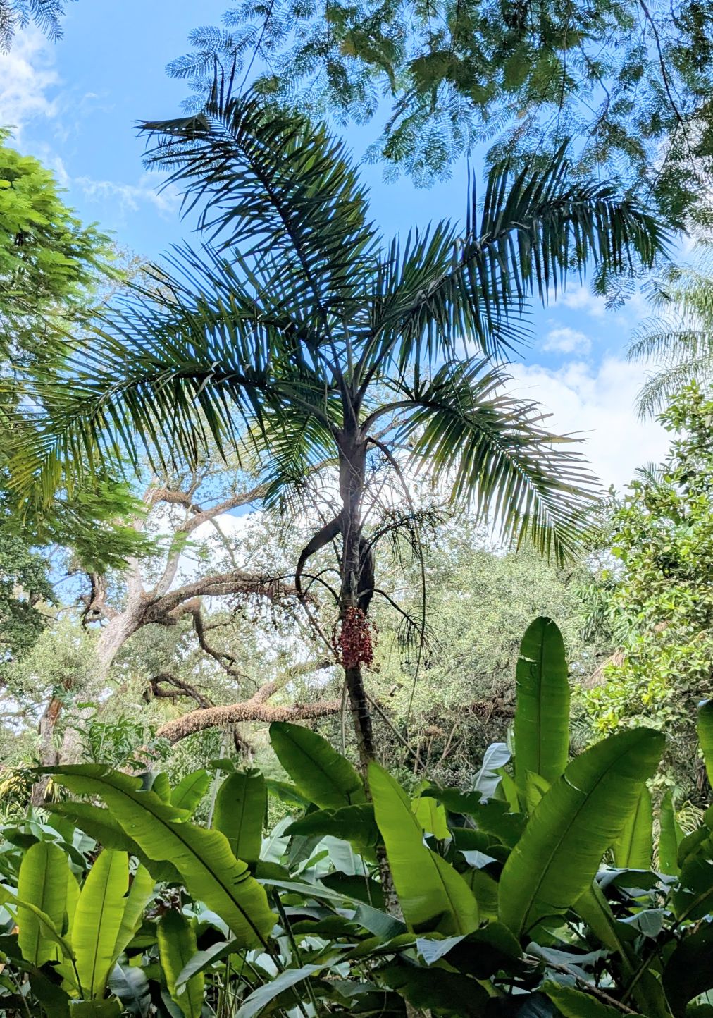Solitairy feather leaf palm to 30′. Trunk light-brown (green further up), ringed, crownshaft poorly formed; foliage fine, slightly plumose, with up to 100 leaflets;