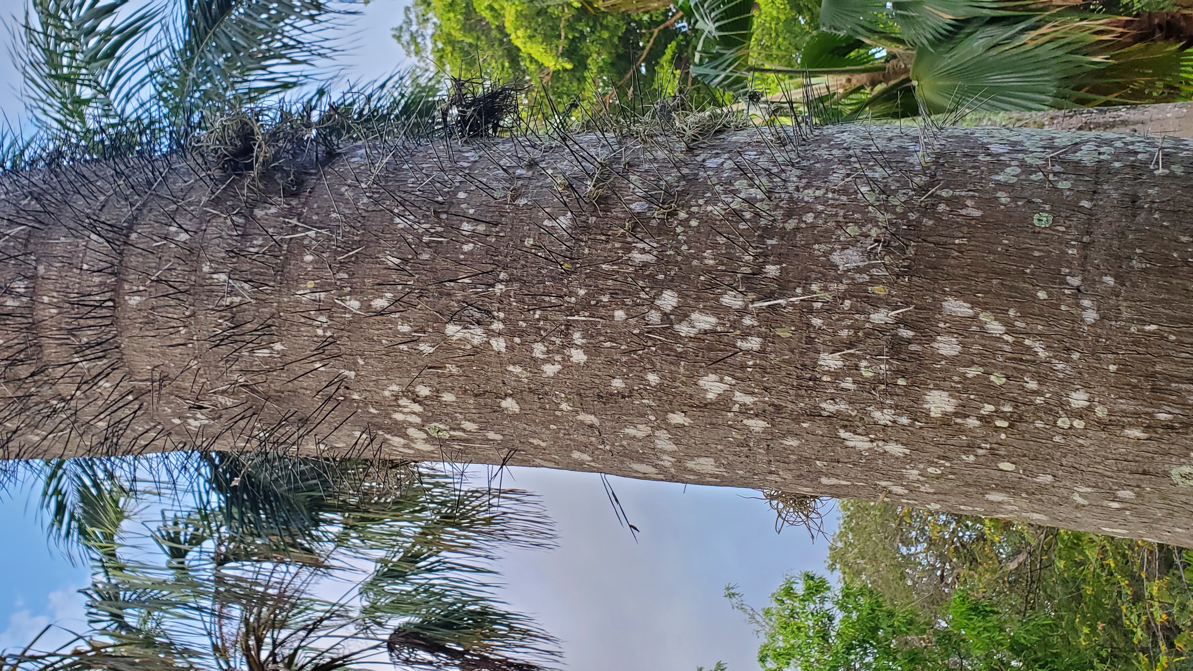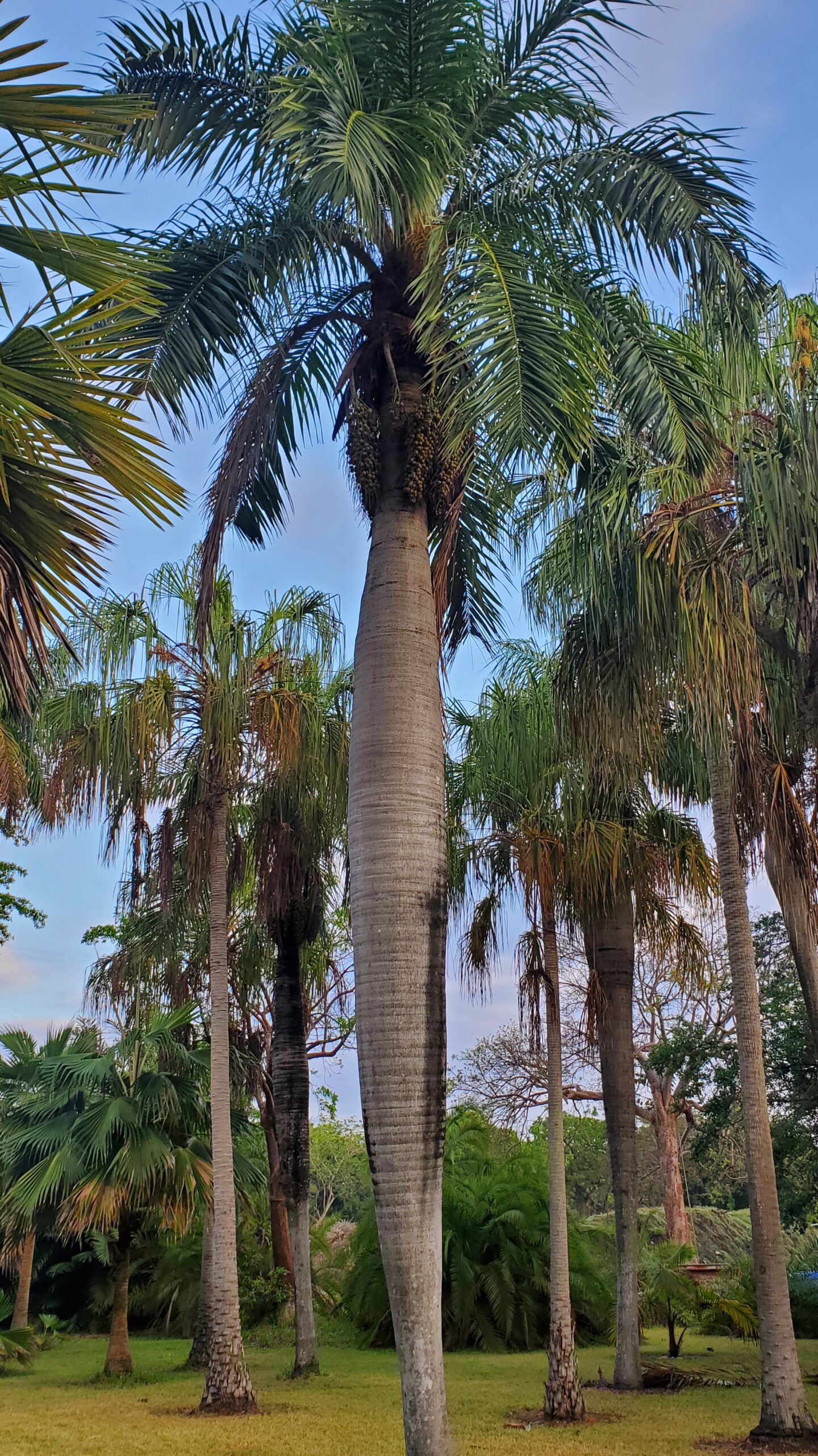 The “Cuban belly palm” with its swollen trunk is endemic to Cuba. It grows to 60 feet with a beautiful rounded crown consisting ofplumose leaves that are dark green above and silvery to grayish-green below. It is viciously armed with spines when young, losing them as it matures. Its yellowish green fruits are round.