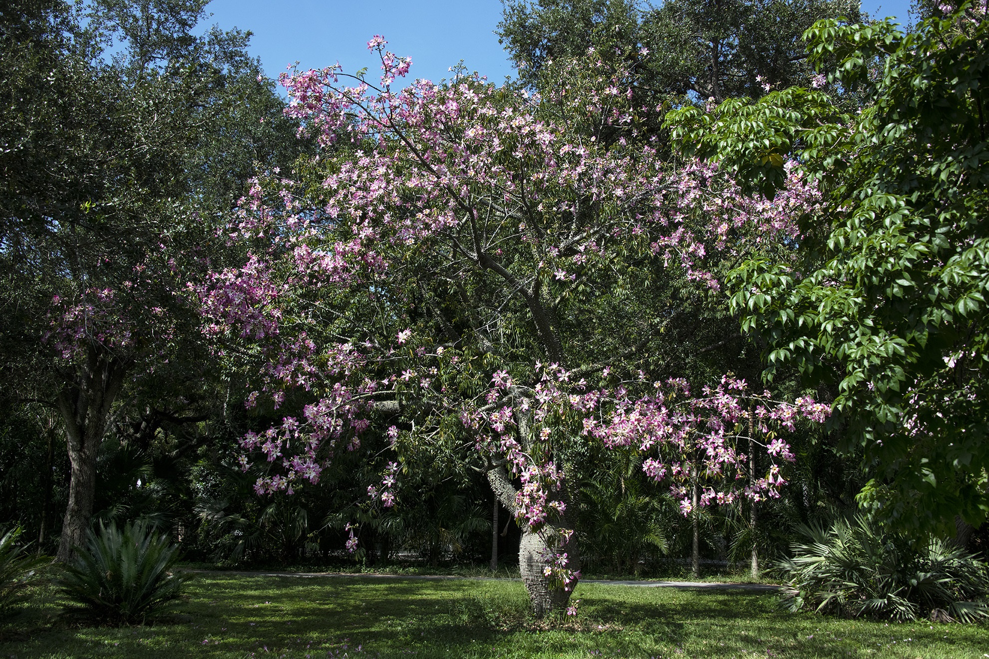 Ceiba speciosa, also called floss-silk tree. This large semi-deciduous tree has several unique and attractive characteristics. Trunk and branches are covered with stout triangular spines, bark is green when young and turns to grey when matured. It can grow to about 60 feet tall and 30 feet wide.