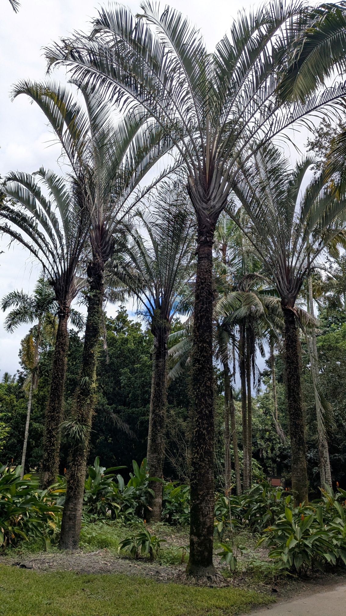 Solitairy feather leaf palm to 30′. Leaves arranged in ranks of 3 on the trunk so as to present a traingular cross-section.