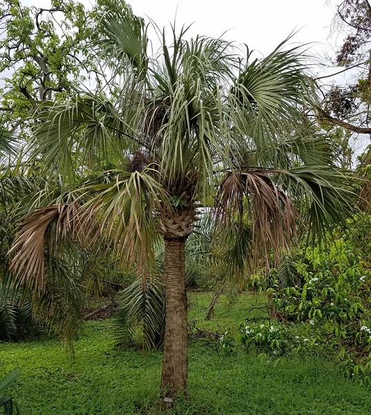 A large, salt- and wind-tolerant, fan-leaved palm of the southeastern U.S. coastal plain (from coastal North Carolina south through Florida and along the Gulf Coast, with occurrences in the northern Caribbean). It develops a stout, unarmed, columnar trunk to tree size, often showing persistent “boots” of old leaf bases below the rounded crown. Leaves are strongly costa-palmate, with many rigid, narrow segments radiating from a prominent costa. It occupies dunes, maritime hammocks, pinelands, and margins of brackish to freshwater wetlands, tolerating sand, limestone, periodic flooding, and salt spray. Inflorescences are many-branched and interfoliar, typically reaching to about the level of the leaves, and bear abundant small, shiny black drupes. Common name: cabbage palmetto.