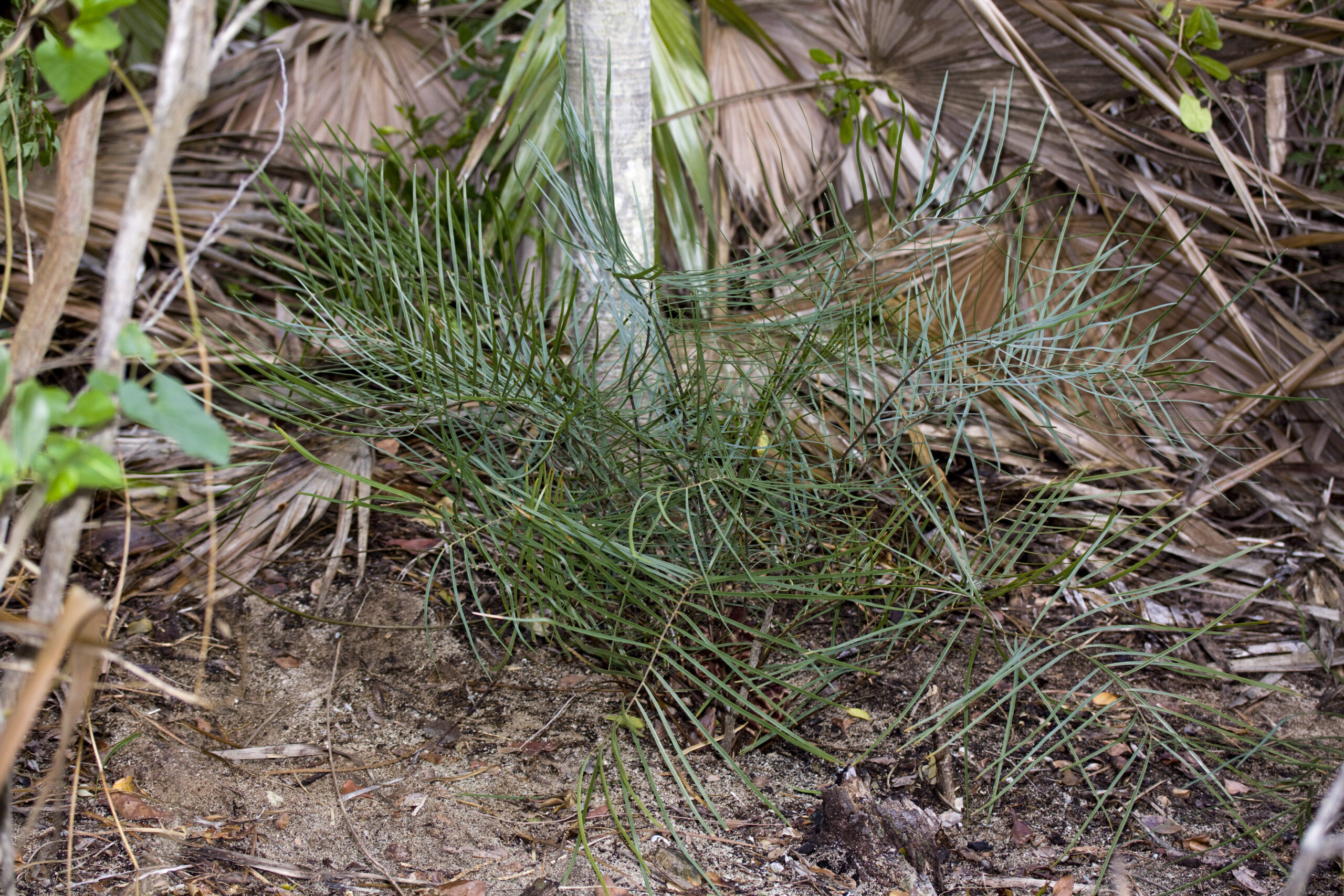Zamia angustifolia is a small cycad native to the island of Eleuthera, Bahamas. It is characterized by its subterranean stem and extremely narrow leaflets. It is listed as Vulnerable by the IUCN and as Appendix II by CITES.