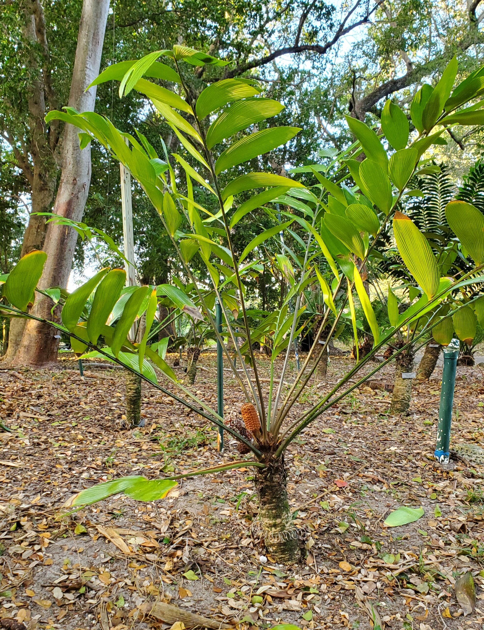 Zamia nesophila is an arborescent species from Panama that is characterized by extremely broad plicate leaflets. It has trunks to 9 feet tall and 9 inches in diameter, holds up to 20 leaves per crown that can exceed 7 feet in length. The leaflets are up to 15 inches long and 4 inches wide. Native to sandy soil near beaches, this species should be relatively salt tolerant and is one of the easiest to grow within a group of related species known as the Zamia skinneri complex.